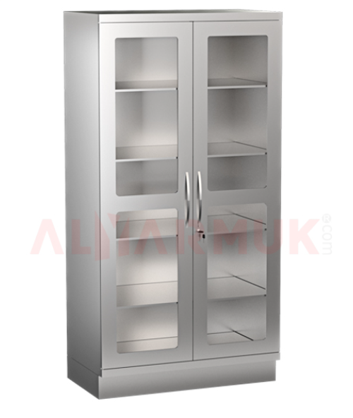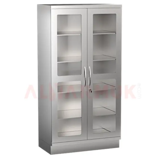 Stainless steel medical cabinet, 195 cm high, 100 cm wide, 50 cm deep, with an acrylic door for visibility.