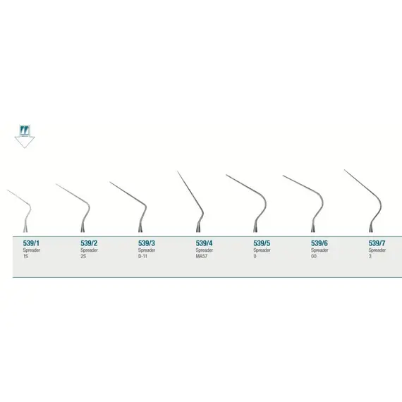 SPREADER: recognizable from its pointed tip and its stem, which is bended in many different ranges. The spreader is mostly used for the following applications: cold working to laterally compact the guttaperca into the endodontic canal; heat carrier to carry the heat into the endodontic canal through a previously heated tip.