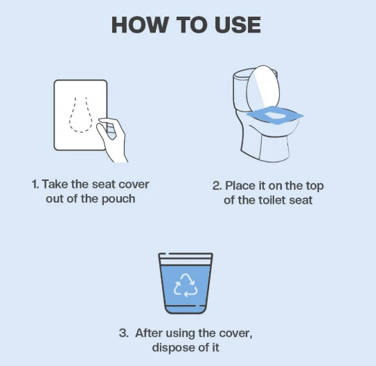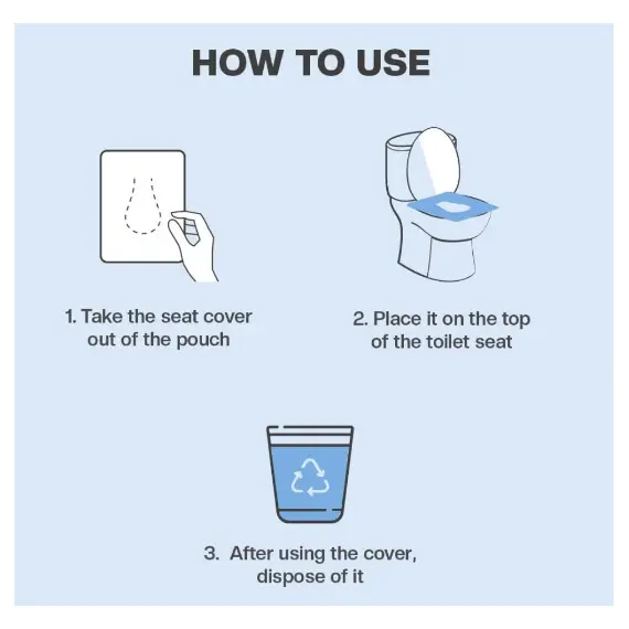 - How to use: Remove the disposable toilet seat cover from the pouch and place it on top of the toilet seat. After use, dispose of the cover in the trash.