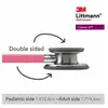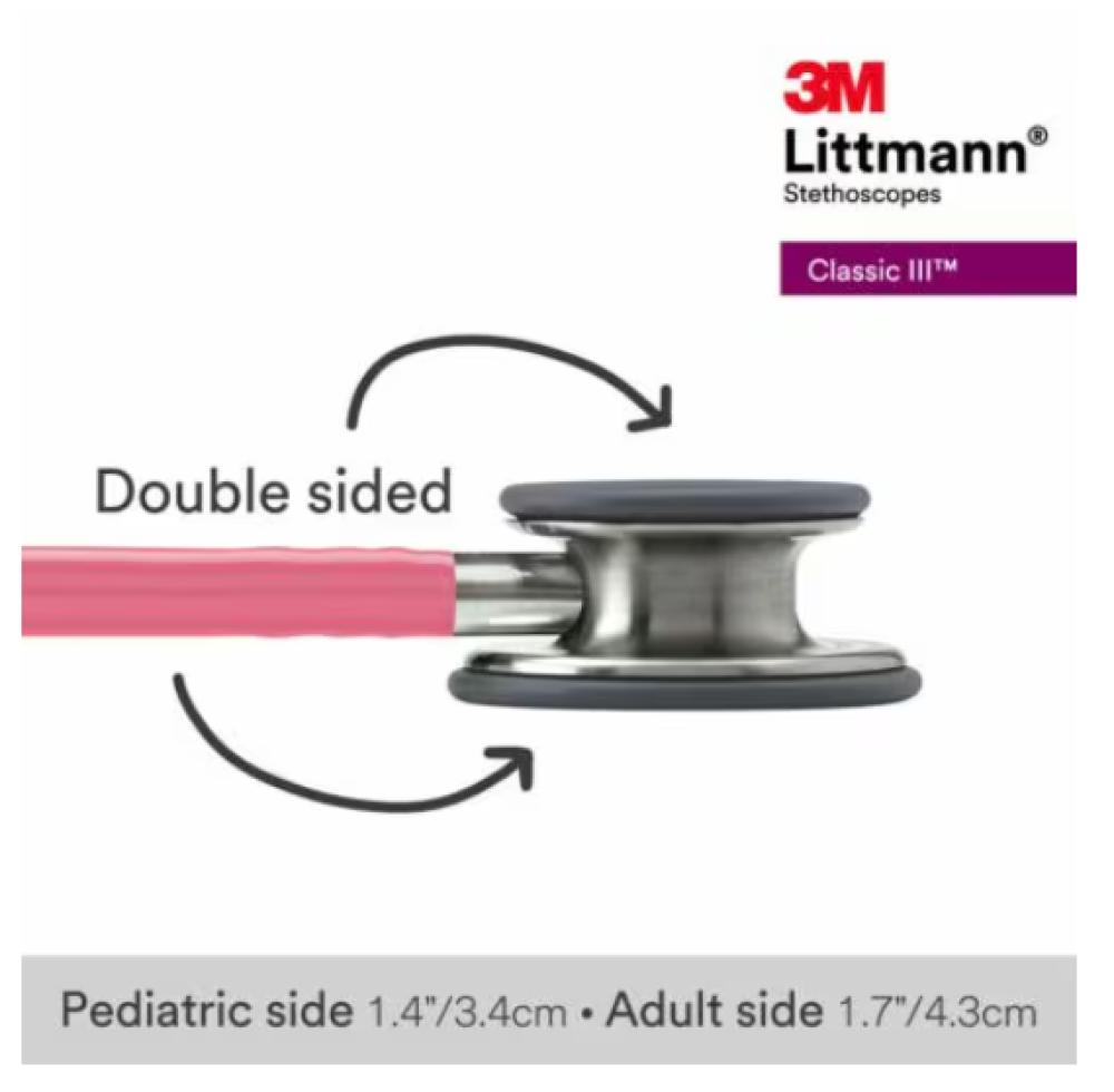 Adjustable membranes on both sides of the chest for adults and children. The pediatric side is useful for small or thin patients, around bandages, and for assessing the carotid artery.