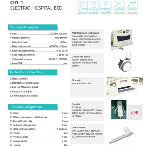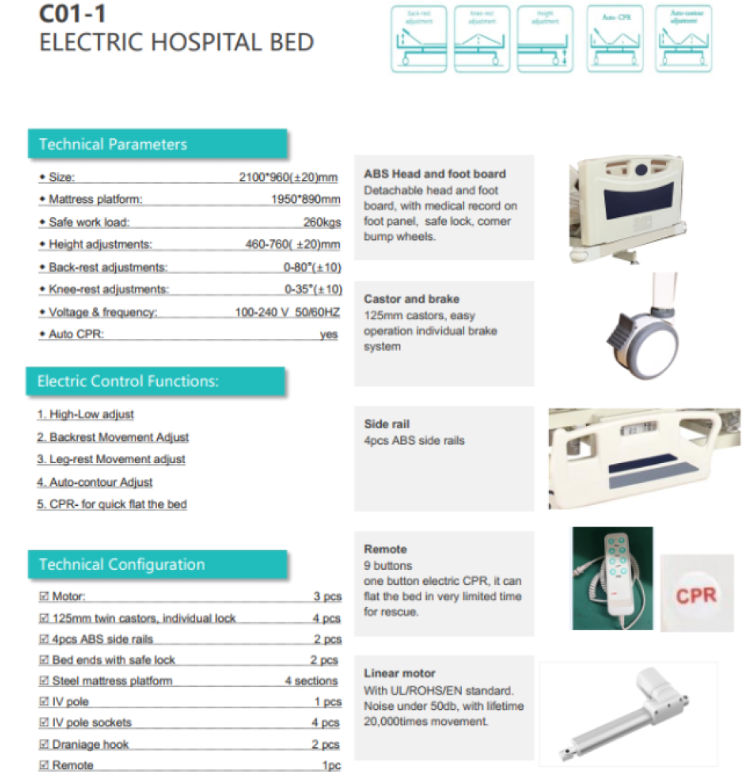 - Specifications of a Chinese-made 5-movement electric bed with hydraulic side panels:- Electric bed with 5 positions, used in hospitals or at home for the comfort of the patient and their family by controlling the bed positions with a remote control.