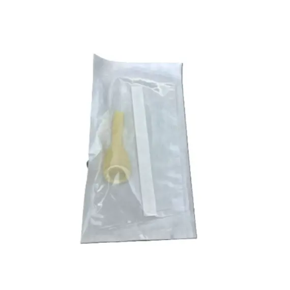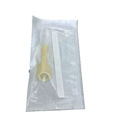 A male external catheter made of silicone, consisting of a connecting tube, a support tube, and a cap. It is used