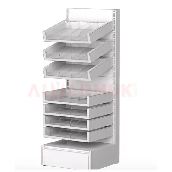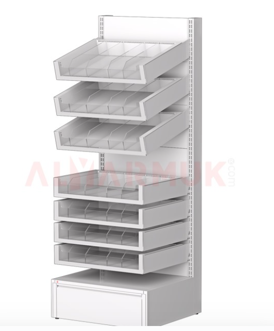 Features 7 adjustable shelves that can be positioned upright or tilted, and pull out.