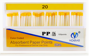 Absorbent Paper Points, length marked, tapered 6%, size #20. Used in endodontic procedures for precise and efficient root canal drying.