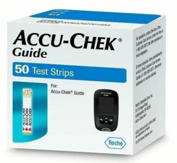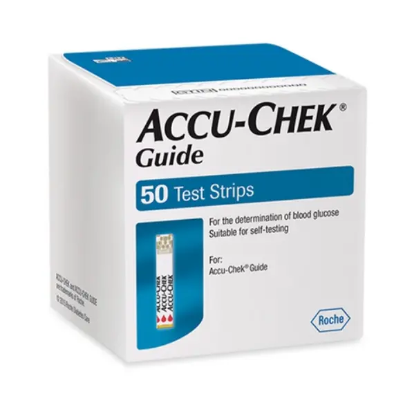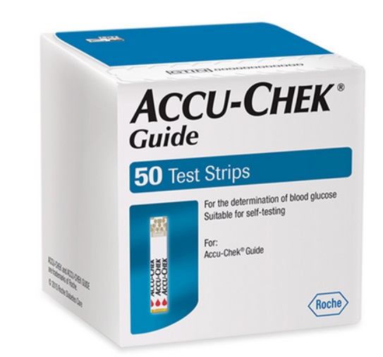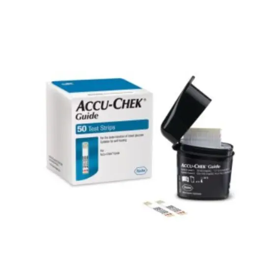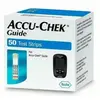 - The AccuChek Guide blood glucose test strip features a simple and easy-to-use design. The strip is inserted into the blood glucose meter, and the measurement results are read on the screen.