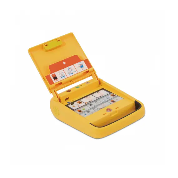 A defibrillator designed to deliver an electric shock to the heart to try to revive it