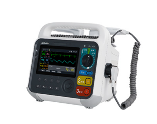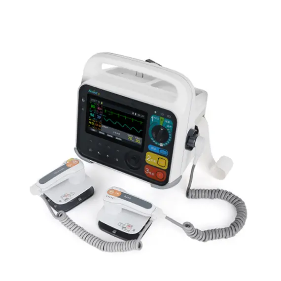 Innovative 4-in-1 defibrillator. Real-time monitoring of ECG, blood oxygen, blood pressure, carbon dioxide, respiration, and body temperature via two channels.