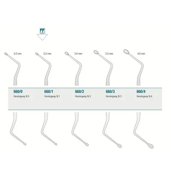 Double-ended Hemingway Bone Curette is a debulking instrument used in small bone and periodontal procedures. It features oval, cupped tips with sharp edges used to scrape away bone fragments.