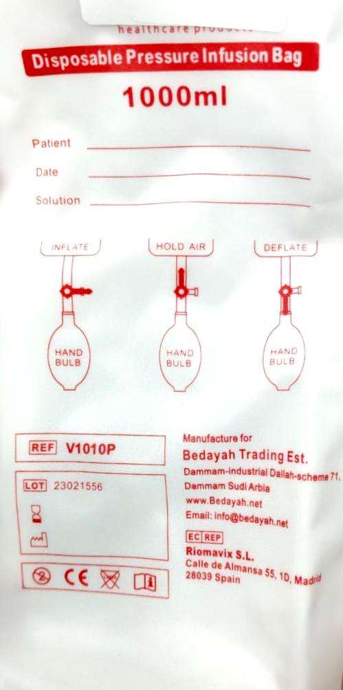 كيس ضغط تسريب المحاليل الطبية – 1000 مل (Disposable Pressure Infusion Bag)