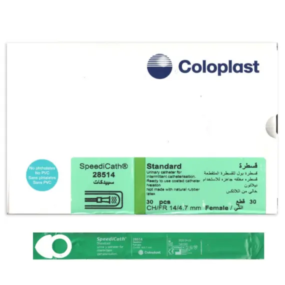 مقاس 14 / 28514 قسطرة مغطاة بمادة مزلقة جاهزة مع المحلول المزلق جمع البول انثى Coloplast Speedicath
