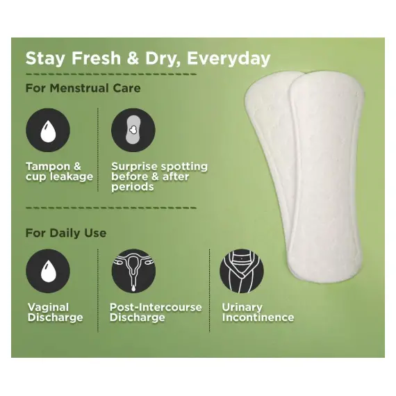 - مثالية للاستخدام اليومي لأنها لا تمتص الإفرازات اليومية فحسب، بل يمكن استخدامها أيضًا كبديل للفوطة العادية والسدادات القطنية ويمكن استخدامها أيضًا لعلاج سلس البول الطفيف.