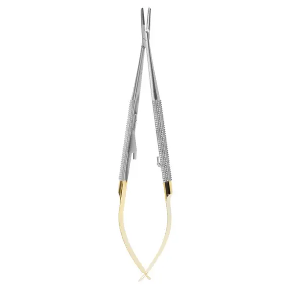 For needles: 4-0, 5-0, 6-0 Used to grasp suture needles during suturing when pushing/pulling the needle and suture through tissue. It has short serrated jaws at the distal end to provide better grip of the needle and it is available in a wide variety of sizes and designs, such as: 1) a self-retaining, scissors-like design with ring handles at the proximal end; 2) a tweezer-like design with bowed, hinged handles that are operated by squeezing them together; and 3) a heavy-duty pincer-like design. some types may utilize inserts made of hard materials (e.g., tungsten carbide) and include scissor blades.