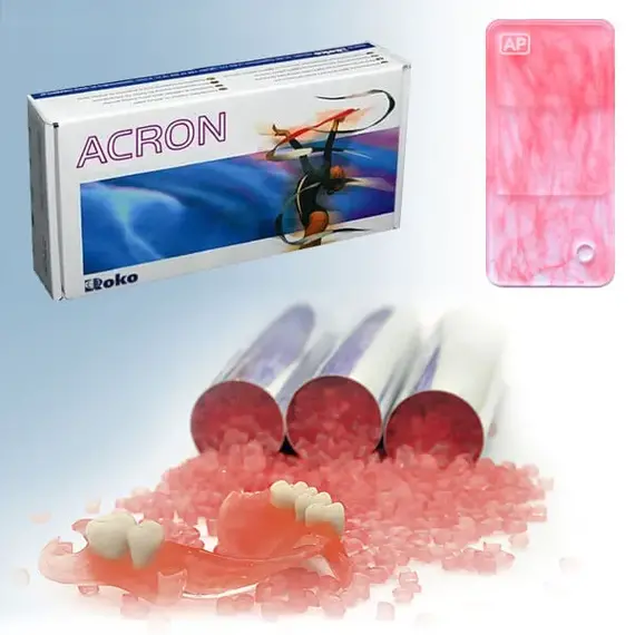 ACRON is a pure, crystal homopolymer. In contrary to copolymers like mix of acrylic, nylon or acetal with other fillers ACRON reach the highest requirements for a biocompatibility that has been medically certified and approved. RESISTANT TO CRACKS AND DISCOLOROTAION and FOR ALLERGY SUFFERERS MELTING TEMPERATURE 260-275 °C MELTING TIME 15-18 min