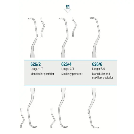Maxillary posteriors For the removal of sub-gingival calculus and for the root cleaning. Designed to work in all areas of the mouth with a semicircular tip used at 90° to the tooth root surface. Both sides of each blade can cut.