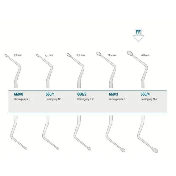 Double-ended Hemingway Bone Curette is a debulking instrument used in small bone and periodontal procedures. It features oval, cupped tips with sharp edges used to scrape away bone fragments.