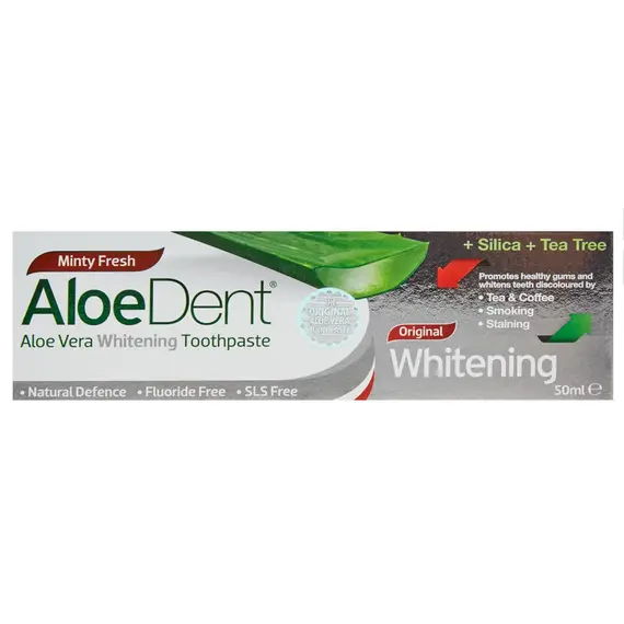 معجون أسنان ألويدنت تي بي لتبييض الأسنان الخالي من الفلورايد، ٥٠ مل، هو معجون أسنان طبيعي يحتوي على خلاصة الصبار والسيليكا وزيت شجرة الشاي لتنظيف وتبييض الأسنان واللثة الحساسة بلطف، كما أنه خالٍ من الفلورايد وكبريتات لوريل الصوديوم والمواد الكيميائية القاسية، ويمنحك نفسًا منعشًا ويزيل البقع بشكل طبيعي لابتسامة أكثر إشراقًا. صُمم للاستخدام اليومي، ويعزز صحة الفم بمكونات نباتية، .