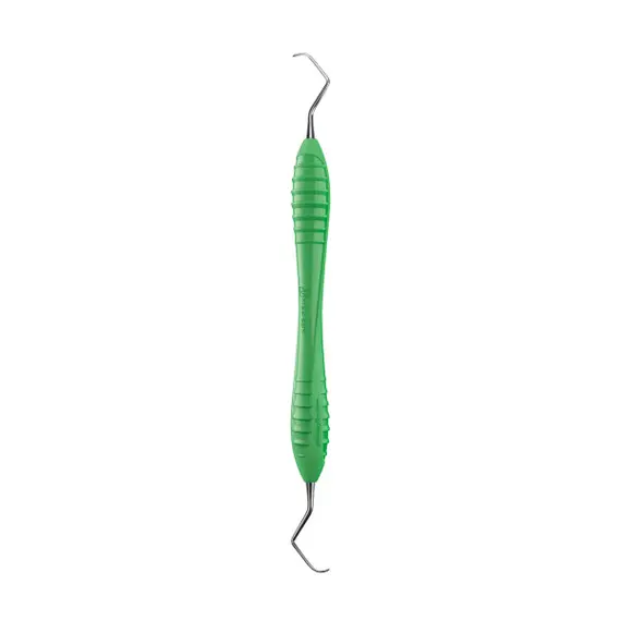 For the removal of sub-gingival calculus and for the root cleaning. Gracey curettes are the most popular and common, less traumatic than the Universal type. They are site specific as they are designed and assorted to adapt to the specific area or tooth surface to be treated. The blade of the Gracey curette is off set from the terminal shank at 70,° and sharped only in one side. 9-10 Buccal/lingual surfaces. Ergonomic LEVANTE Silicon handle.