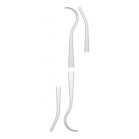 For the removal of sub-gingival calculus and for the root cleaning. Designed to work in all areas of the mouth with a semicircular tip used at 90° to the tooth root surface. Both sides of each blade can cut.