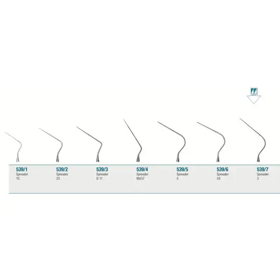 SPREADER: recognizable from its pointed tip and its stem, which is bended in many different ranges. The spreader is mostly used for the following applications: cold working to laterally compact the guttaperca into the endodontic canal; heat carrier to carry the heat into the endodontic canal through a previously heated tip.