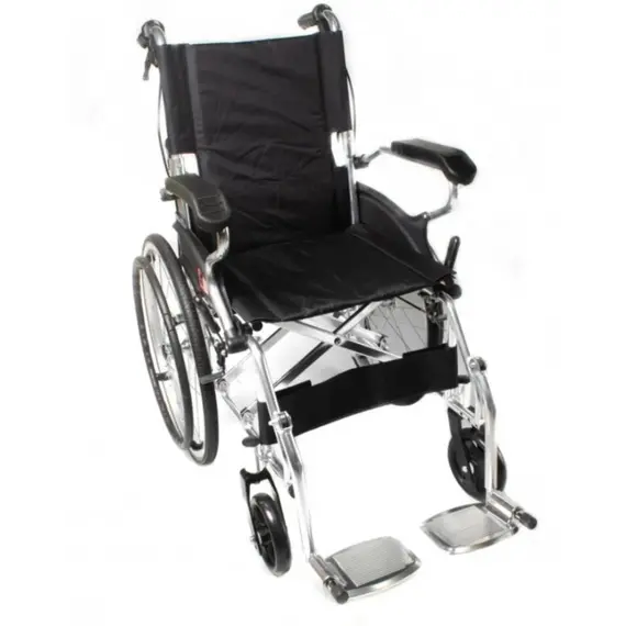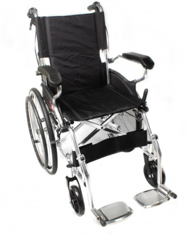 كرسي متحرك خفيف الوزن ومتين مصنوع من الألمنيوم، مصمم لتوفير الراحة وسهولة التنقل. يأتي بمقعد متوسط الحجم لضمان ملاءمة مريحة لمعظم المستخدمين، مع مساند للذراعين والقدمين لزيادة الدعم. تصميمه القابل للطي يسهل التخزين والنقل. مناسب للاستخدام اليومي داخل المنزل أو خارجه، ويجمع بين المتانة وخفة الوزن لراحة المستخدم.