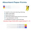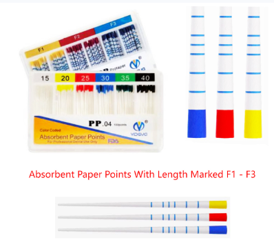 أوراق امتصاص Absorbent Paper Points, طول محدد، مقاسات F1 – F3. تُستخدم في علاج جذور الأسنان لتجفيف القنوات بدقة أثناء إجراءات الحشو السني.