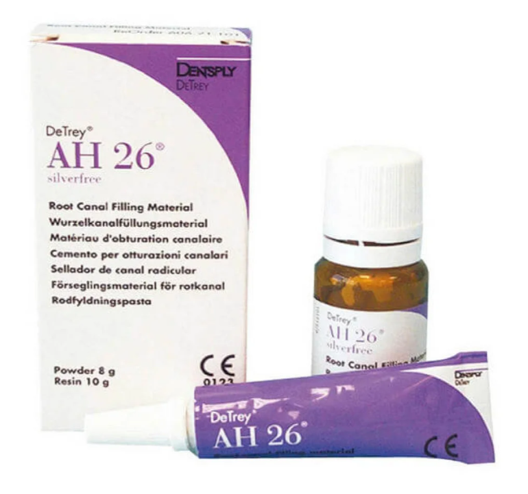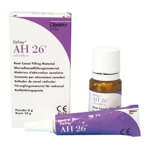 The AH 26 Standard Package includes 8 gm of powder and 10 gm of resin.The powder and resin are a radiopaque root canal sealer with a silver-free formulation. Applicable with all filling techniques, it has excellent flow properties for total sealing combined with excellent volume stability.