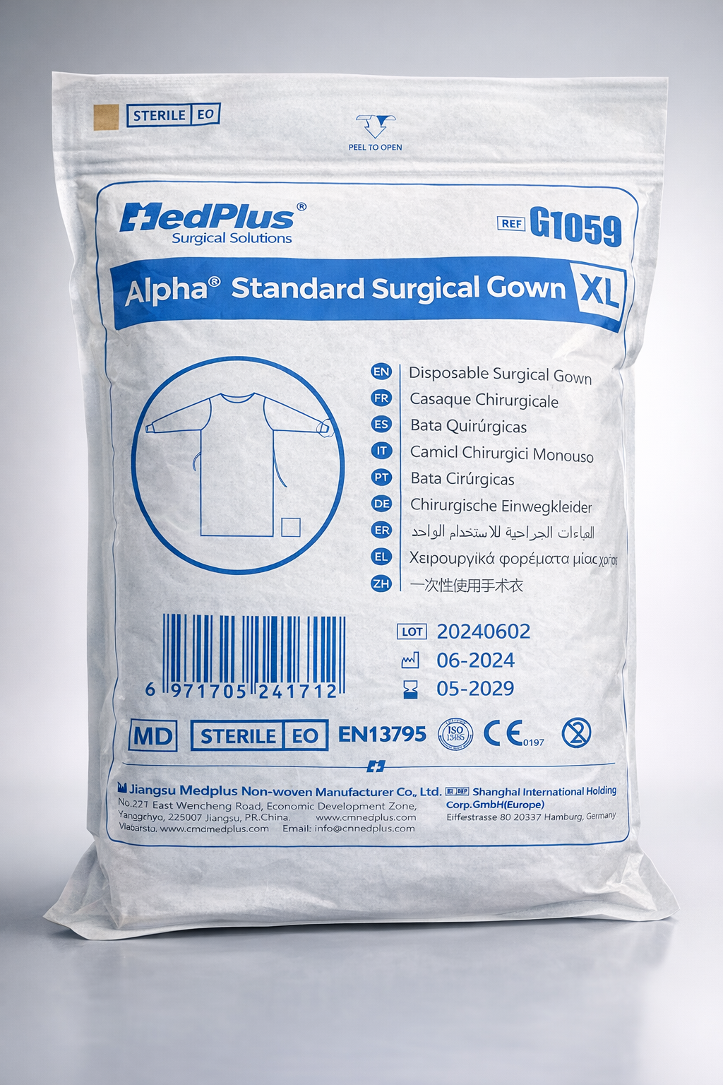 رداء جراحي قياسي للاستعمال مرة واحدة، معقم بغاز أكسيد الإيثيلين (EO)، مصمم لتوفير حماية عالية والحد من انتقال العدوى أثناء الإجراءات الطبية والجراحية. مصنوع من خامات غير منسوجة عالية الجودة لراحة أفضل وتهوية مناسبة، مناسب للاستخدام في المستشفيات والعيادات. المقاس: XL.
