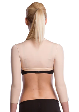 مشد ضاغط للذراعين بعد العمليات الجراحية بأكمام ثلاثة أرباع الطول، وثلاثة صفوف من الخطافات قابلة للتعديل في الجزء الأمامي.