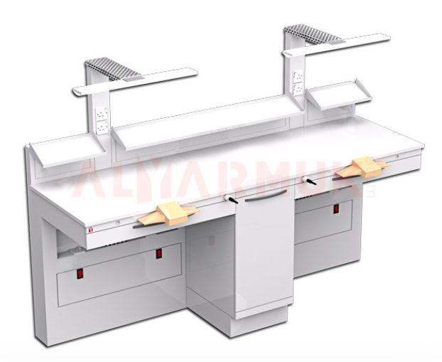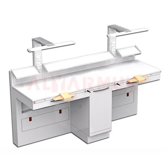 بنش فني أسنان مزدوج مصنوع من الحديد المجلفن المقاوم للصدأ ومطلي بطلاء كهربائي مقاوم للخدوش والبكتيريا، مزود بمصباحين علويين، 2 أداة شفط، 5 مداخل كهرباء، 2 درج، و3 رفوف علوية معدنية لتنظيم الأدوات.
