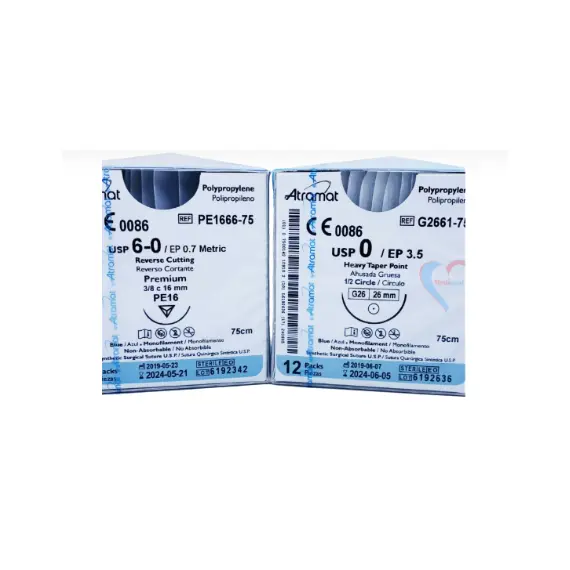 مواصفات خيوط جراحية بولي بروبلين: خيوط صناعية أحادية من مادة البولي بروبيلين. غير قابلة للامتصاص وتتميز بقوة شد عالية. أكثر مرونة من الخيوط الجراحية الأخرى ويسهل التعامل معها. مناسبة للاستخدام في جراحات الفتق والقلب والأوعية الدموية والمسالك البولية وطب الأطفال والجراحة التجميلية. مناسبة للاستخدام مع الجروح الملوثة لعدم تداخلها مع الجروح. لا تتأثر بالعامل الإنزيمي للأنسجة ولا تفقد متانتها. مناسبة في الإجراءات التي تتطلب قوة عالية لفترة طويلة. مسبقة التعقيم بأكسيد الإيثيلين. متوفر بعدة مقاسات العلامة التجارية: Atramat.