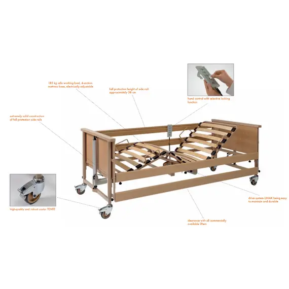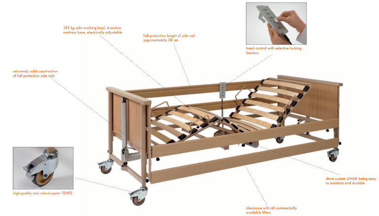يمكن تعديل الظهر ولبقدم وكذلك الارتفاع والانخفاض بواسطة المحركات الكهربائية. المحركات تقوم بعمل 4 حركات مختلفة الأجزاء المعدنية مطلية بطبقة طلاء من مسحوق البوليستر ألواح لوح الرأس والقدم مصنوعة من خشب الزان. التحكم اليدوي مع وظيفة القفل الاختياري. يمكن تطبيقة في حالة عدم الاستخدام لتوفير المساحة صناعة المانية