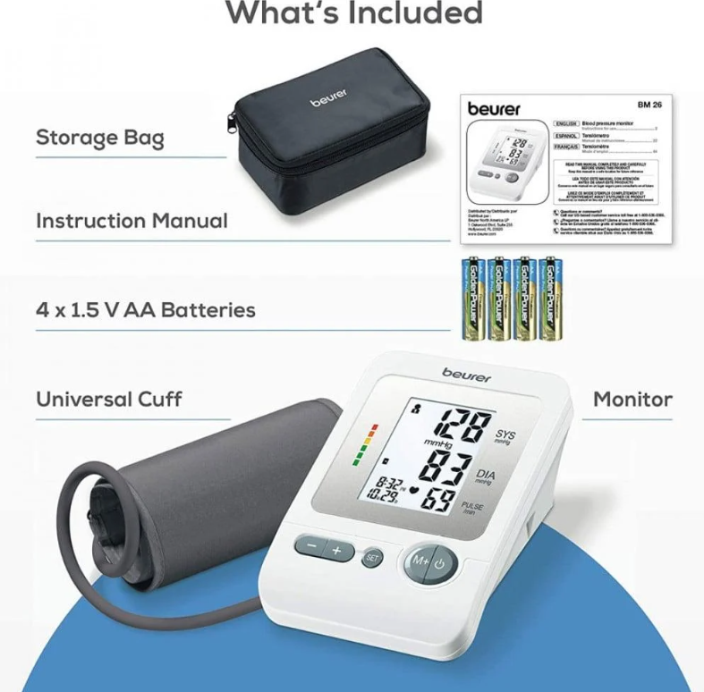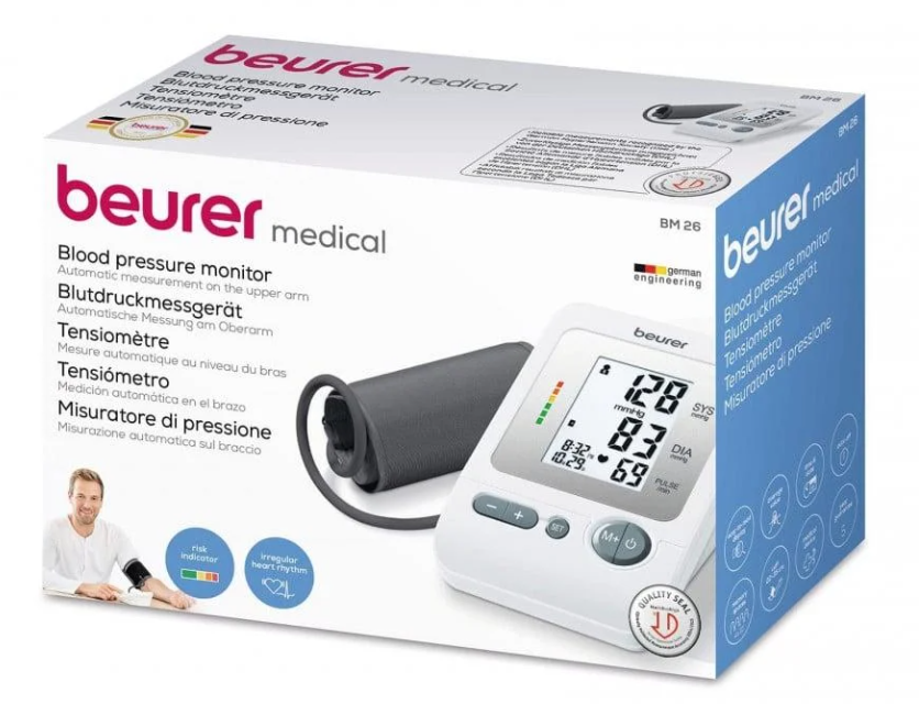 جهاز Beurer BM26 لقياس ضغط الدم هو النموذج التقليدي لأجهزة قياس الضغط العالمية من Beurer بدقتها وكفاءتها المشهورة، حيث حصل جهاز قياس ضغط الدم BM26 has على موافقة من WHO (مؤسسة الصحة العالمية، كما يتميز بقياس تلقائي لضغط الدم والنبضات في أعلى الذراع مع سوار يكفي محيط ذراع من 23-35 سم. ويحتوي جهاز BM26 على 4 x قنوات ذاكرة، يحتوي كل منهما على 30 سعة للذاكرة، كما أنه مزود بحافظة عملية للسفر أو للحفظ ودليل مستخدم بسيط للاستخدام.
