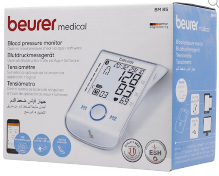 جهاز لقياس ضغط الدم عن طريق أعلي الذراع. قياس ضغط الدم والنبض بطريقة أوتوماتيكية بالكامل عن طريق المعصم. يمكن توصيلة بالهواتف الذكية ونقل القراءات إليها عن طريق البلوتوث®. إمكانية توصيلة بالكمبيوتر مع وجود كابل USB. متوسط لكل القراءات المُخزنة. متوسط لقراءات الصباح والمساء لآخر 7 أيام. يستخدم لشخصين مع سعة تخزين 60 قراءة لكل شخص. شاشة كبية جدا من نوع LCD. ميزة تنبيه عدم انتظام ضربات القلب. رابطة ذراع قياس 22 – 42 سم. بطارية ليثيوم قابلة لإعادة الشحن. نصائح لقياس ضغط الدم بدقة: توقف عن أي تمارين رياضية أو مشى قبل نصف ساعة من القياس. توقف عن تناول المشروبات التي تحتوي على كافيين وكذلك توقف عن التدخين قبل نصف ساعة من القياس. قم بإفراغ المثانة من البول. خُذ فترة راحة 5 دقائق قبل القياس، اسند ظهرك مستقيما، قم بإزالة أى ملابس ضيقة من مكان القياس، ولا تجعل قدماك متشابكتان. لا تتحدث أثناء القياس ولا أثناء فترة الراحة. يجب أن تقوم بالقياس مرتين بينهما فاصل زمني دقيقتين ثم قم بأخذ متوسط القياسين.