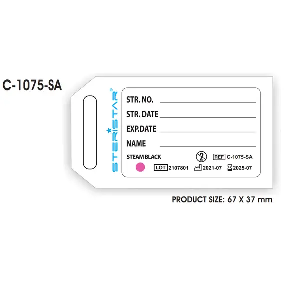Sterilization container labels are designed to be used in the pocket of the containers. Two kinds of container labels are available as self-adhesive and non-self-adhesive label. It is easy to understand whether sterilization has been performed because of the indicators on the label. Water-based and non-toxic chemical indicator is used. It is easy to read and interpret. Compatible with ISO 11140-1. Different designs are made for the company/person on request. Self-Adhesive versions can be used as a permanent record for traceability purposes.