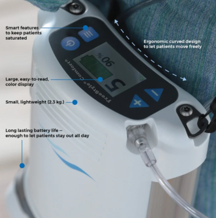 - Caire Freestyle comfort عبارة عن مكثف أكسجين محمول عالي السعة يوفر للمرضى كل الأكسجين الذي يحتاجونه.