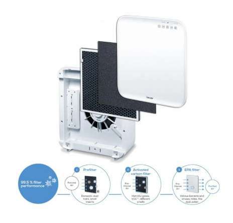 عمل بويرر، جهاز تنقية الهواء LB 310، المصنوع باستخدام التكنولوجيا الألمانية، على تنقية الهواء من الغبار وشعر الحيوانات، والروائح، وحبوب اللقاح والغبار الناعم، وكذلك العديد من أنواع البكتيريا والفيروسات!