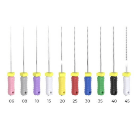 الملفات اليدوية - يشير مصطلح "ملف K" إلى ملف K، وهو نوع من الأدوات اليدوية لعلاج لب الأسنان مصنوع من الفولاذ المقاوم للصدأ، ويستخدمه أطباء الأسنان في علاج قناة الجذر. تُستخدم هذه الملفات الملتوية لاستكشاف قناة الجذر، وتحديد طولها، وإجراء التنظيف اليدوي والتحضير. تتميز ملفات K بمقطعها العرضي المربع أو المثلث، واستخدامها لحركات ربع دورة ذهابًا وإيابًا، وقدرتها على تجاوز العوائق في قناة الجذر.
