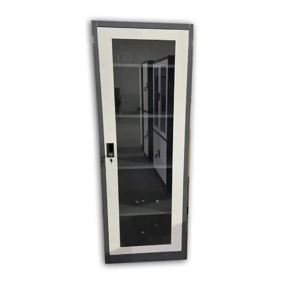 - مصنوع من المعدن، مع باب زجاجي مع القفل.
