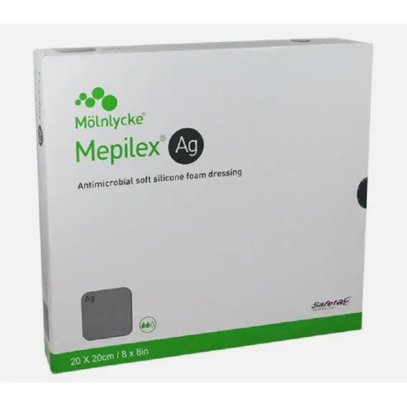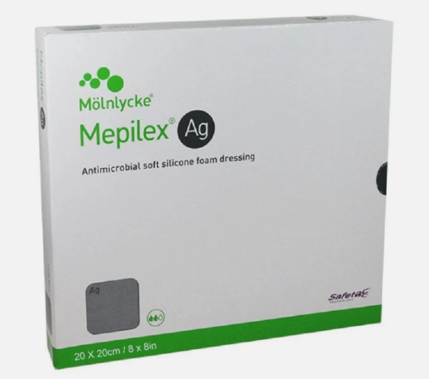 - Mepilex Ag عبارة عن ضمادة للعناية بالجروح تتكون من وسادة رغوية ماصة من مادة البولي يوريثين مدمجة مع مركب كبريتات الفضة.