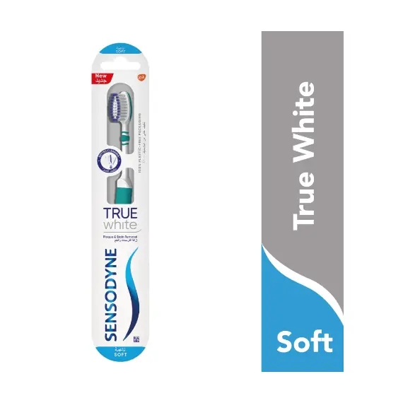 فرشاة أسنان سنسوداين ترو وايت مصممة من قبل الخبراء للأشخاص ذوي الأسنان الحساسة. شعيرات متطورة منظفة تساعد في إزالة البلاك من على الأسنان. الشعيرات الخارجية الناعمة ذات النهايات المتدرجة مصممة خصيصاً لتنظيف حتى المناطق التي يصعب الوصول إليها بلطف.