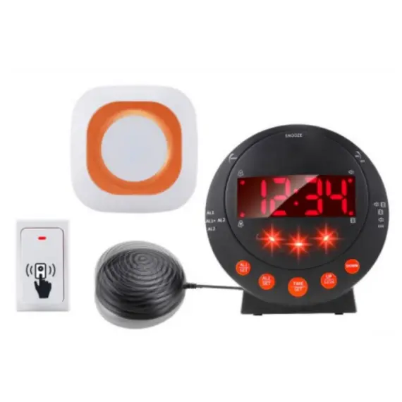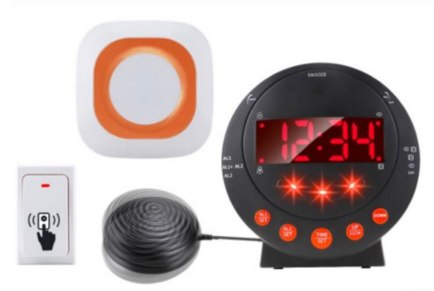 جهاز مخصص لتنبیه ذوي الاعاقة البصریة او السمعیة عن طریق الاهتزاز والصوت والاضاءة مع وسادة اهتزاز توضع تحت المخدة متزامن مع جرس الباب ولمبة وصوت واضاءة