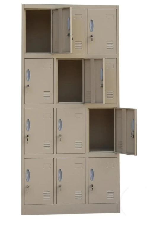دولاب حديد للمكاتب أو للمستشفيات مكوّن من 12 درج تخزين بتصميم عملي، كل درج مزود بقفل خاص لتأمين المحتويات. مثالي للاستخدام في المستشفيات، المدارس، الجامعات، مكاتب الشركات وبيئات العمل المختلفة. يُستخدم كـ خزانة دولاب حديد للموظفين لحفظ الملفات أو المتعلقات الشخصية. مصنوع من حديد عالي الجودة بلون بيج أنيق، يجمع بين المتانة والشكل العملي، ويوفر حلاً مثاليًا للتنظيم في أي مساحة عمل.