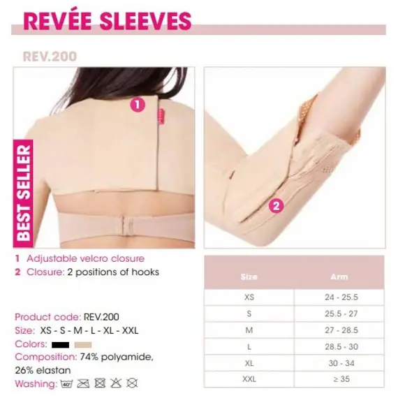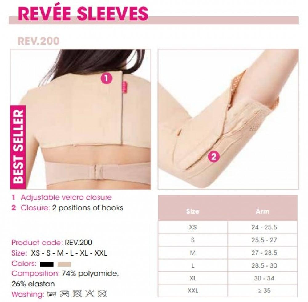 يجب أن يتم القياس واختيار الحجم الصحيح من قبل الطبيب الذي يحدد مدة الاستخدام بناءً على نوع الجراحة. هذه المدة تتوافق عادة مع بضعة أسابيع. للحصول على أفضل النتائج، يجب ارتداء أكمام Revée ليلاً ونهارًا. يسمح إغلاق الفيلكرو الخلفي بإمكانيات تعديل مختلفة ويسهل التطبيق من خلال ضمان الضغط الصحيح