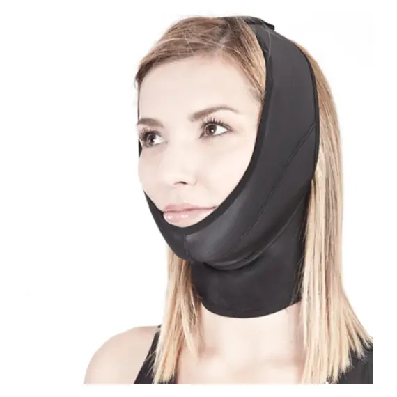 مشد مستخدم بعد عمليات شد الوجه ورأب الذقن. إنها تتكيف بشكل مثالي مع شكل الوجه. يسهل الإغلاق بخطاف وحلقة الاستخدام، مما يضمن الضغط الصحيح على الوجه والذقن.