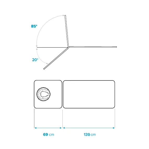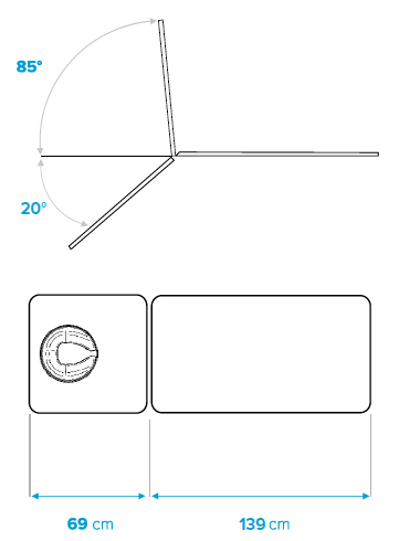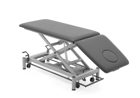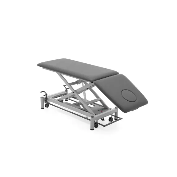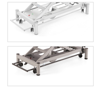 E-S2.F0: طاولة تدليك وعلاج من قسمين بنظام عجلات أساسي، تتكون من عجلتين صغيرتين وساقين بأقدام مطاطية مانعة للانزلاق.