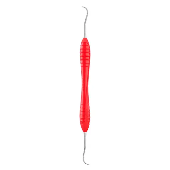 Sickle scaler designed for the removal of supragingival calculus. Handle diameter 8mm. Exclusive LEVANTE ergonomic silicon handle.