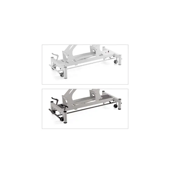 E-S2.F0: طاولة تدليك وعلاج من قسمين بنظام عجلات أساسي، تتكون من عجلتين صغيرتين وساقين بأقدام مطاطية مانعة للانزلاق.