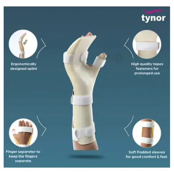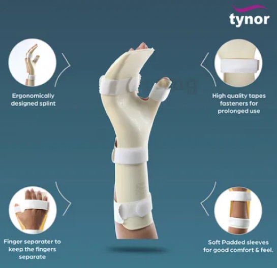 صمم للحد من الألم والتورم عن طريق توفير دعم مريح وشل في الوضع الطبيعي إلى مفاصل اليد والرسغ. يقلل من تهيج الأعصاب في نفق الرسغي من خلال دعم وراحة المعصم في وضع "حزمة فضفاضة". يحافظ على طول الأنسجة الرخوة وبالتالي منع التقلصات.