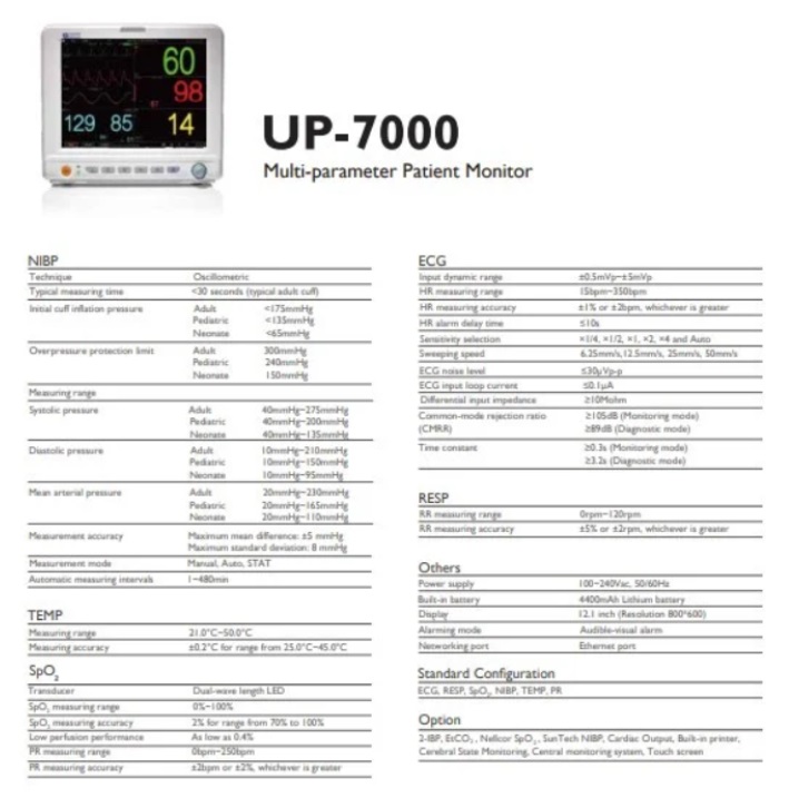 - يمكنكم الحصول على جهاز مراقبة مريض UP-7000 يساهم في تحسين جودة الرعاية الصحية ويسهل عمل الفرق الطبية في مراقبة ورصد حالات المرضى بشكل فعال.