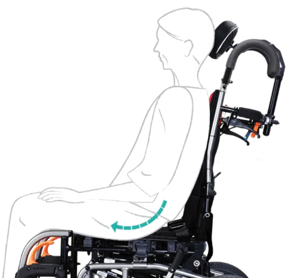 يستخدم مسند الظهر أحزمة فيلكرو قابلة للتعديل، على عكس الكراسي المتحركة التقليدية، وذلك لتغيير التثبيت والهيكل وفقًا لمستخدم الكرسي المتحرك. يساعد هذا على منع التحدّب ومنع أثر التأرجح.